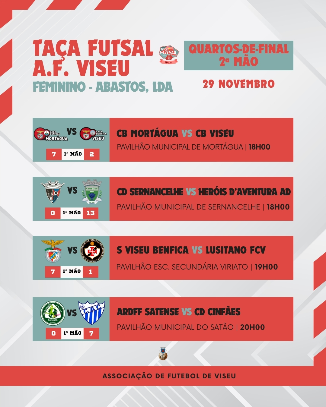 O pontapé de saída da 2ª mão dos quartos-de-final está marcado para este sábado, dia 29 de novembro, seguindo o calendário definido pela Associação de Futebol de Viseu.