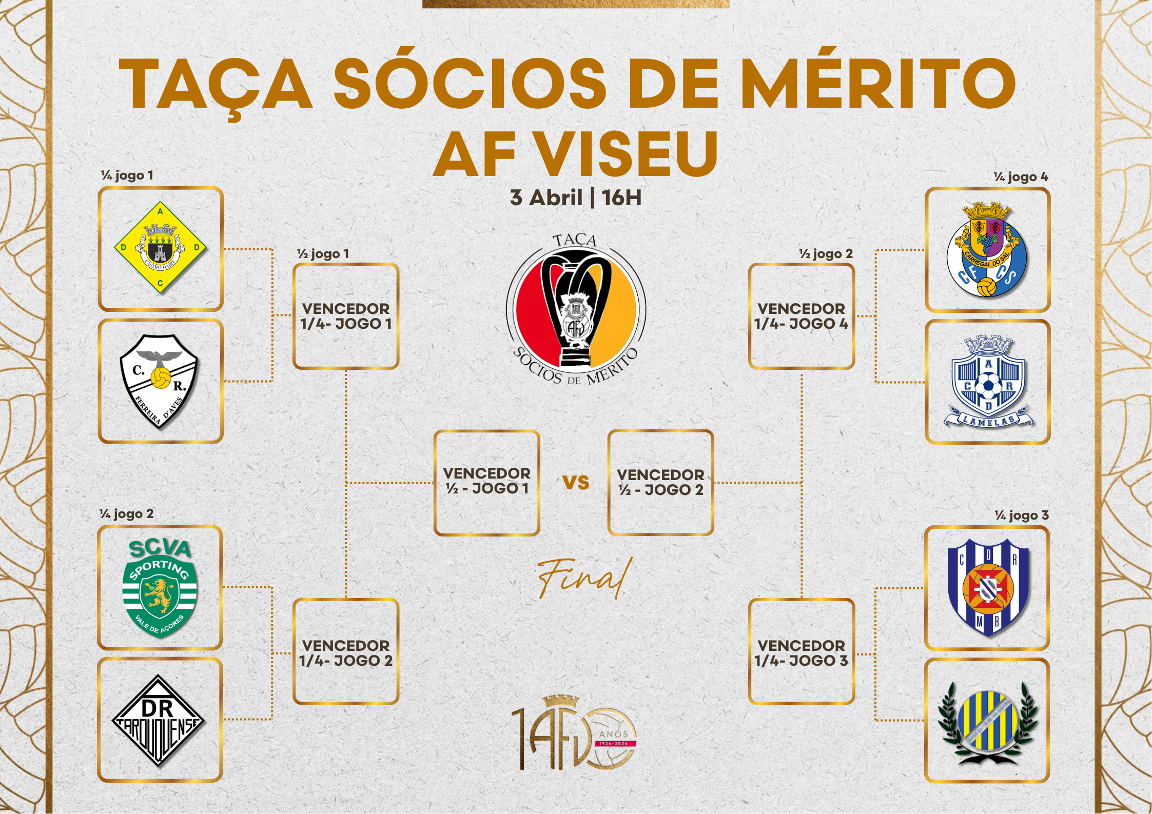 Os quartos de final da Taça Sócios de Mérito AF Viseu estão agendados para esta sexta-feira, dia 3 de abril, com todos os encontros a terem início às 16h, prometendo uma tarde repleta de futebol, emoção, numa competição onde cada detalhe pode fazer a diferença.